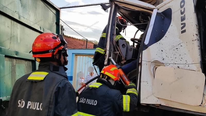 Motorista fica preso nas ferragens após colisão traseira entre dois caminhões