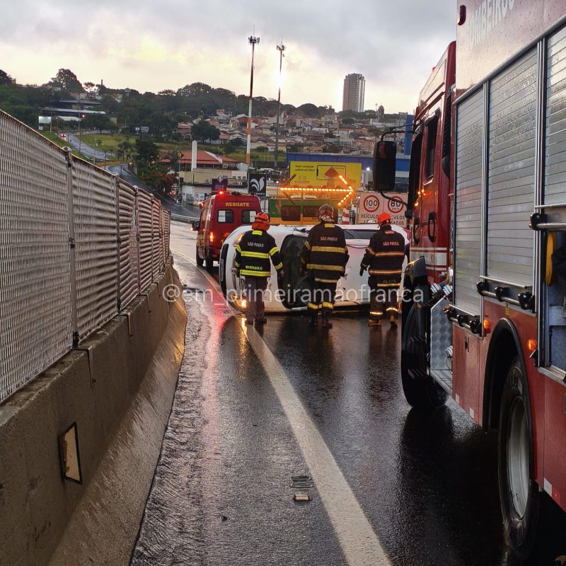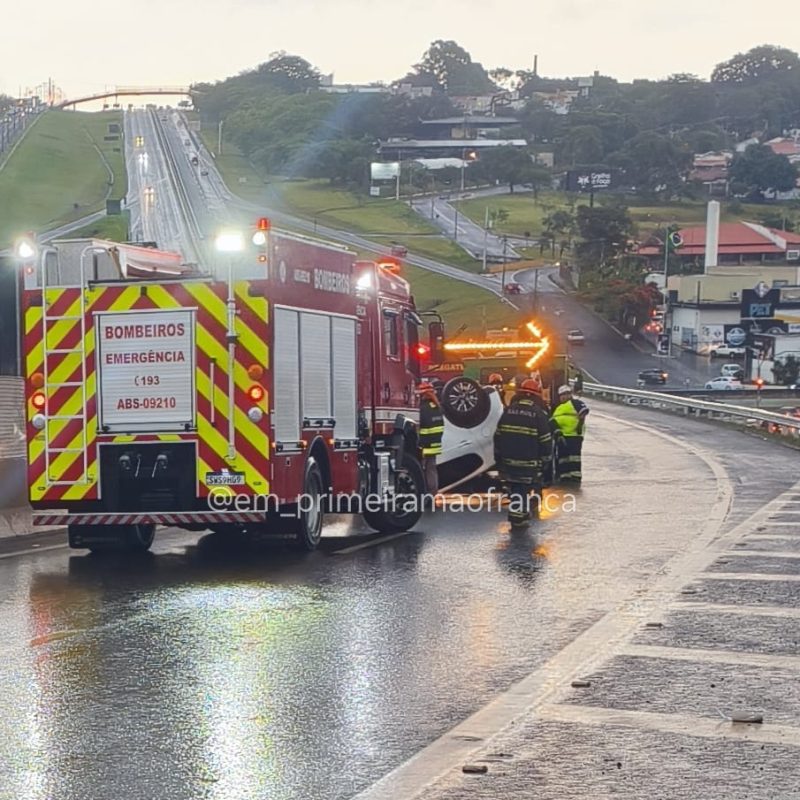 Um carro capotou na tarde deste domingo, 2, na rodovia Cândido Portinari, em Franca. Chovia bastante na hora do acidente.