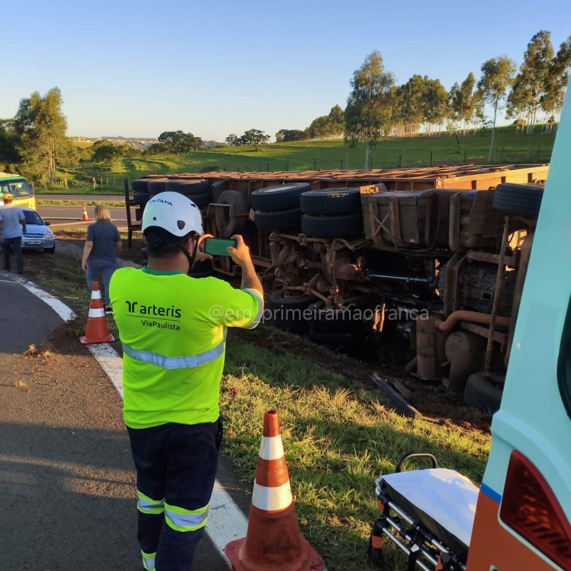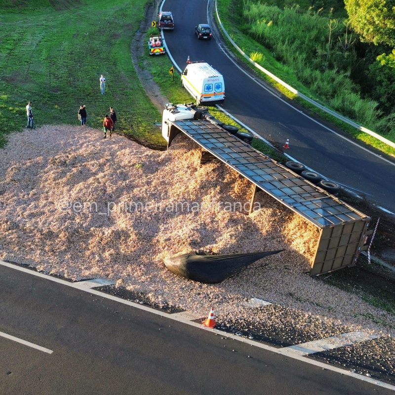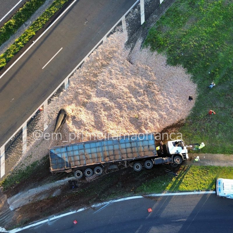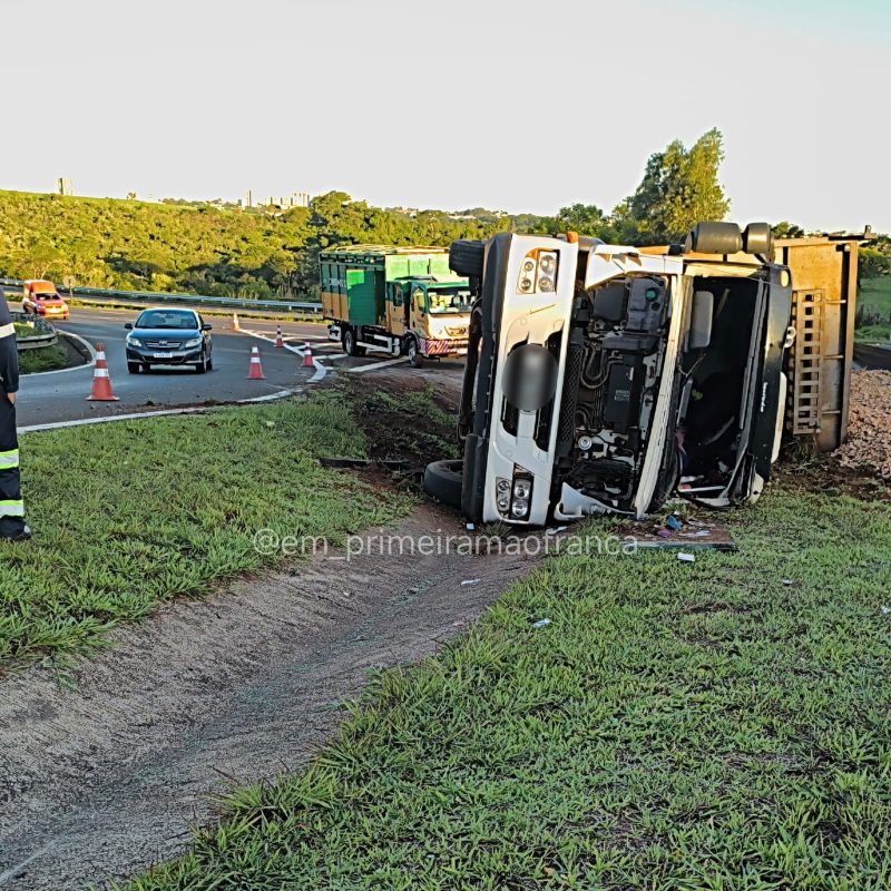 Uma carreta carregada com casca de madeira tombou no final da tarde desta quarta-feira, 26, na alça de acesso da rodovia Prefeito Fábio Talarico para a avenida Severino Tostes Meirelles, no Distrito Industrial, em Franca.