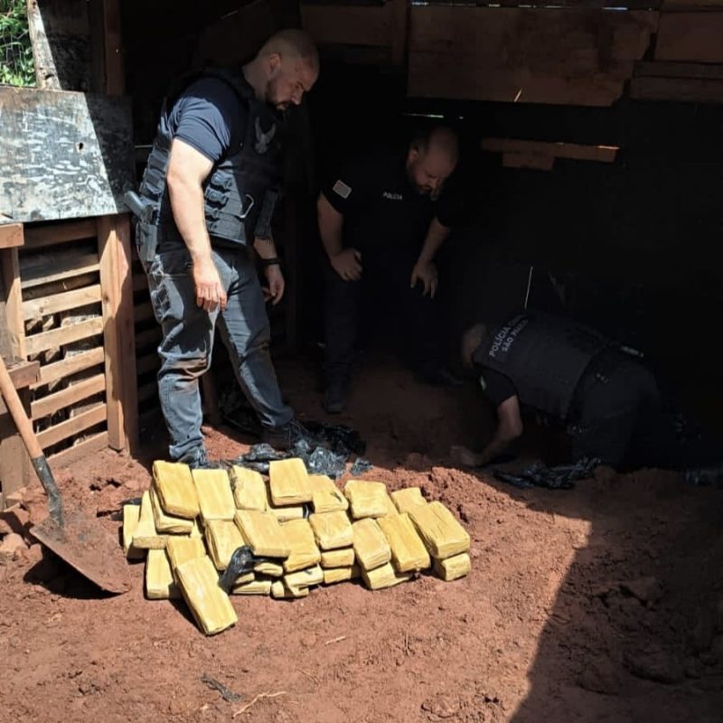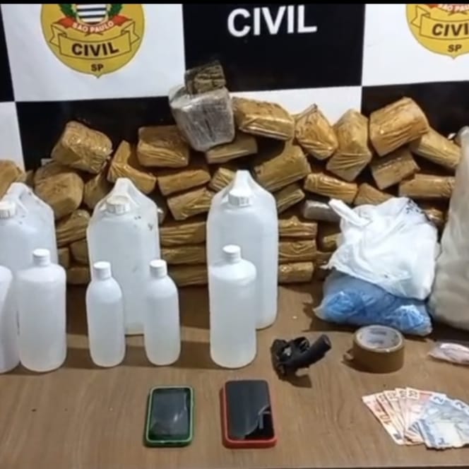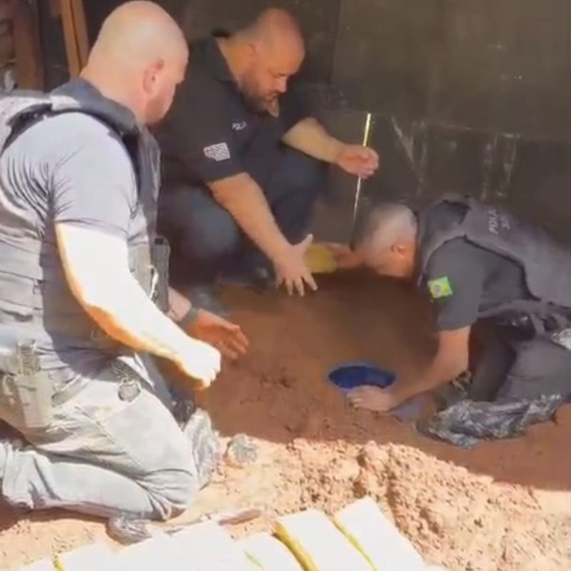 Durante a diligência, os policiais localizaram, no interior do imóvel e também enterrados nos fundos da propriedade, diversos materiais ilícitos. Entre as apreensões estão 82 tijolos de maconha, com peso aproximado de 50 quilos, oito galões de lança-perfume, cada um com cerca de 6.000 ml, e várias porções de cocaína.