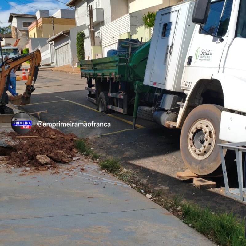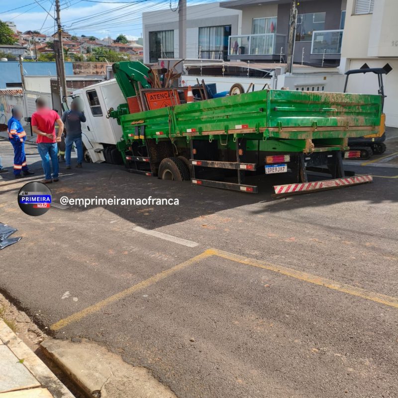 Um caminhão da empresa Seleta ficou preso após afundar durante uma obra na tarde desta quarta-feira, 18, na rua Adibe Augusto Salomão, no bairro São José, em Franca.