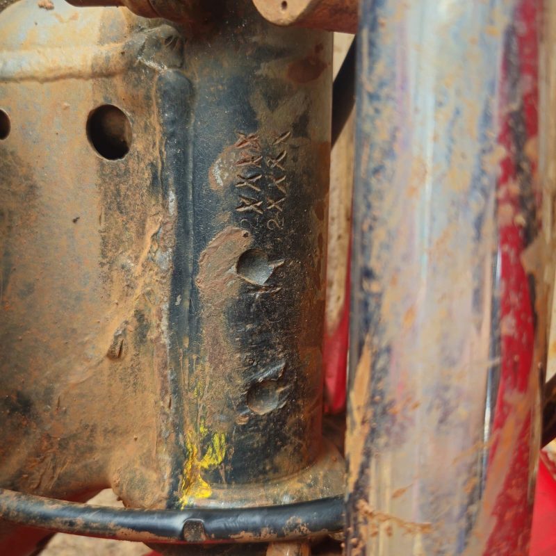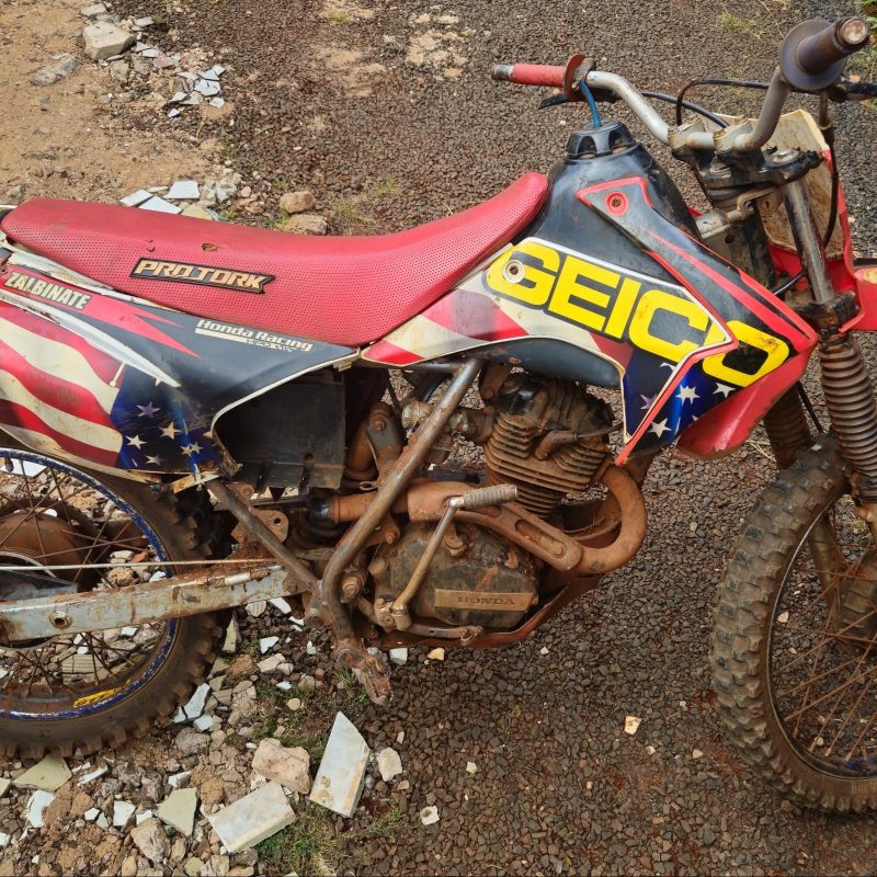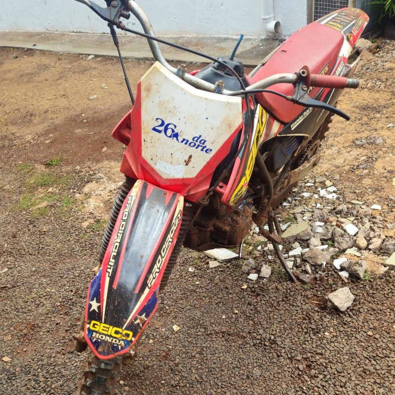 No quintal foram localizadas algumas motocicletas usadas para trilha. Após verificação, foi constatado que uma delas estava com o chassi suprimido. Ela foi apreendida.